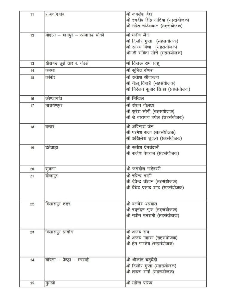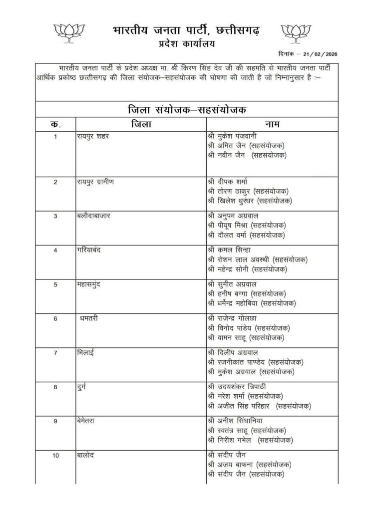 रायपुर/बिलासपुर। भारतीय जनता पार्टी छत्तीसगढ़ प्रदेश कार्यालय से 21 फरवरी 2026 को आर्थिक प्रकोष्ठ के जिला संयोजक एवं सहसंयोजकों की सूची जारी की गई। प्रदेश अध्यक्ष किरण सिंह देव की सहमति से घोषित इस सूची में प्रदेश के सभी जिलों के पदाधिकारियों के नाम शामिल हैं।