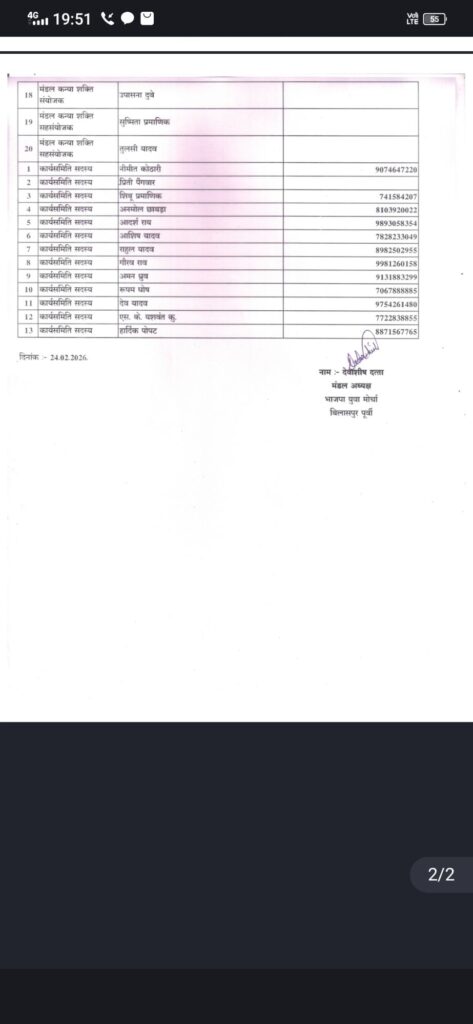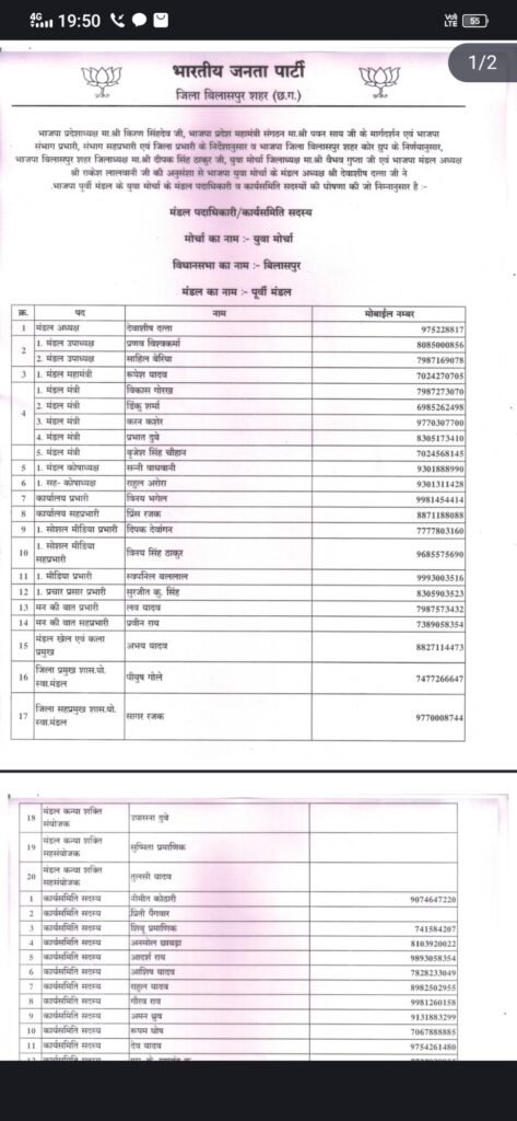 बिलासपुर। भारतीय जनता पार्टी (भाजपा) बिलासपुर शहर जिला इकाई के अंतर्गत युवा मोर्चा पूर्वी मंडल की नई कार्यकारिणी की घोषणा कर दी गई है। यह घोषणा भाजपा प्रदेशाध्यक्ष किरण सिंहदेव एवं प्रदेश महामंत्री (संगठन) पवन साथ के मार्गदर्शन तथा संभाग व जिला प्रभारियों के निर्देशानुसार की गई।