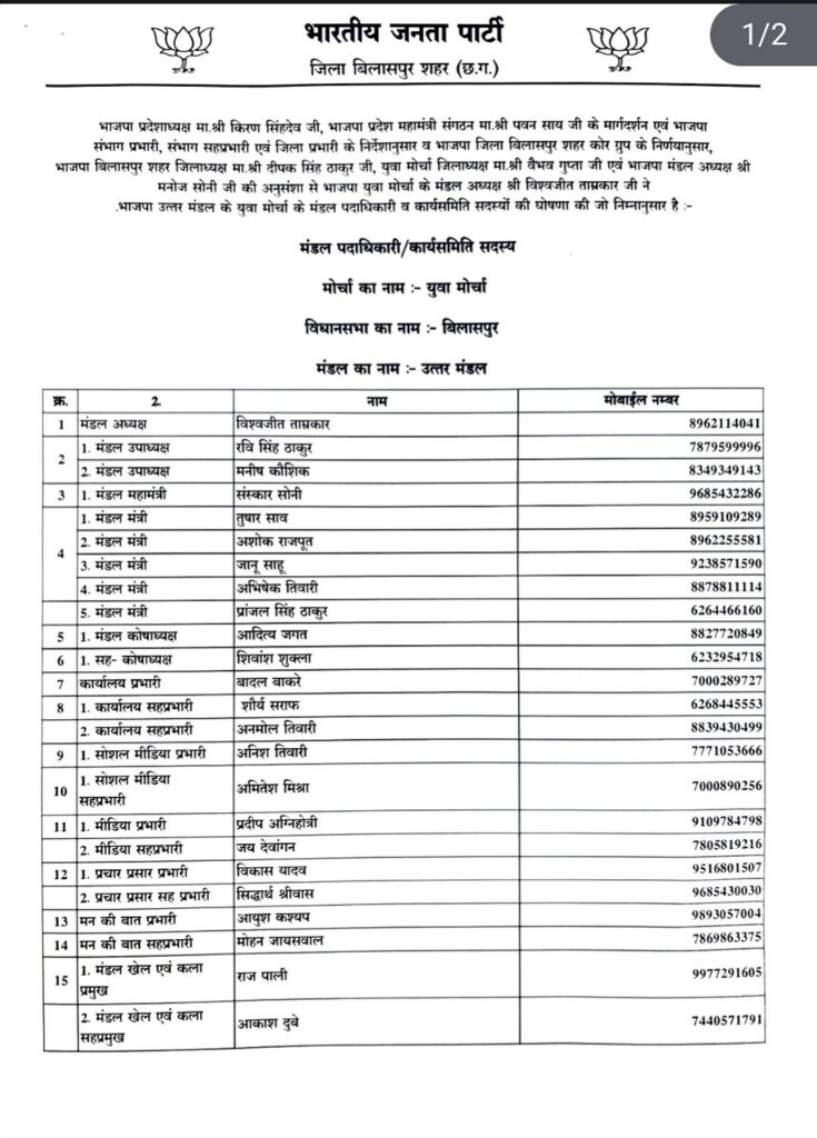 भाजपा जिला बिलासपुर शहर कोर ग्रुप के निर्णयानुसार तथा भाजपा बिलासपुर शहर जिलाध्यक्ष दीपक सिंह ठाकुर, युवा मोर्चा जिलाध्यक्ष वैभव गुप्ता एवं भाजपा मंडल अध्यक्ष मनोज सोनी की अनुसंशा पर मंडल अध्यक्ष विश्वजीत ताम्रकार ने पदाधिकारियों एवं कार्यसमिति सदस्यों के नामों की घोषणा की।