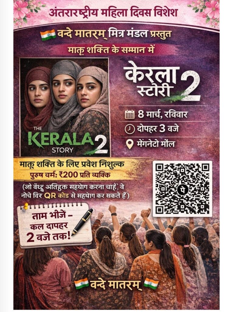 बिलासपुर। अंतरराष्ट्रीय महिला दिवस के अवसर पर शहर में महिलाओं और बेटियों के लिए एक विशेष पहल की जा रही है। वन्दे मातरम् मित्र मंडल द्वारा 8 मार्च को फिल्म The Kerala Story 2 का विशेष प्रदर्शन आयोजित किया गया है। इस कार्यक्रम का उद्देश्य महिलाओं और युवतियों को फिल्म के माध्यम से जागरूक करना बताया गया है।