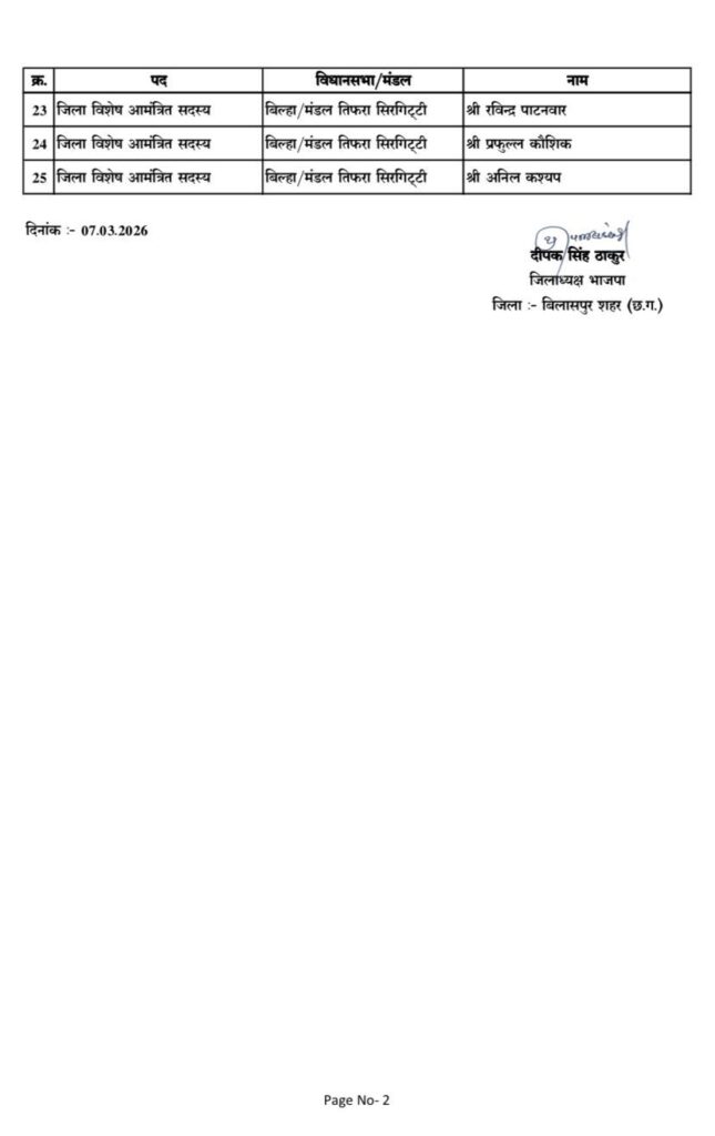 वहीं बिल्हा विधानसभा क्षेत्र के बोदरी, बिल्हा और तिफरा-सिरगिट्टी मंडल से संजय दुबे, सत्यनारायण गोयल, रमाकांत चंदनाहू, संजय सिंह, राजाराम प्रजापति, रविन्द्र पाटनवार, प्रफुल्ल कौशिक और अनिल कश्यप को जिला विशेष आमंत्रित सदस्य नियुक्त किया गया है।
