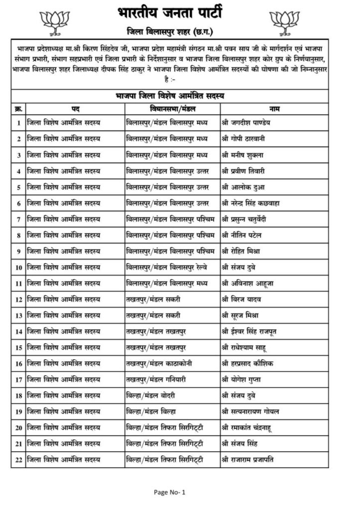 घोषित सूची में बिलासपुर, तखतपुर और बिल्हा विधानसभा क्षेत्रों के विभिन्न मंडलों से नेताओं को जिला विशेष आमंत्रित सदस्य बनाया गया है। इसमें बिलासपुर मध्य, बिलासपुर उत्तर, बिलासपुर पश्चिम और रेलवे मंडल से जगदीश पाण्डेय, गोपी ठारवानी, मनीष शुक्ला, प्रवीण तिवारी, आलोक दुआ, नरेन्द्र सिंह कछवाहा, प्रसुन्न चतुर्वेदी, नीतिन पटेल, रोहित मिश्रा, संजय दुबे और अविनाश आहूजा को जिम्मेदारी दी गई है।