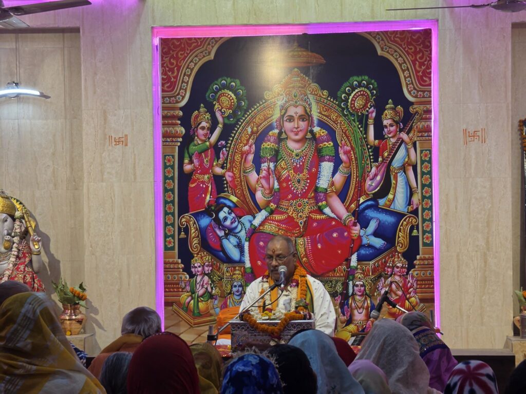 आज की कथा का मुख्य केंद्र रक्तबीज वध का प्रसंग रहा। आचार्य जी ने बड़े ही ओजस्वी ढंग से वर्णन किया कि कैसे रक्तबीज की हर एक बूंद से नए राक्षस पैदा हो रहे थे, तब माँ काली ने अपने खप्पर में उसका रक्त पान कर अधर्म को समूल नष्ट किया।