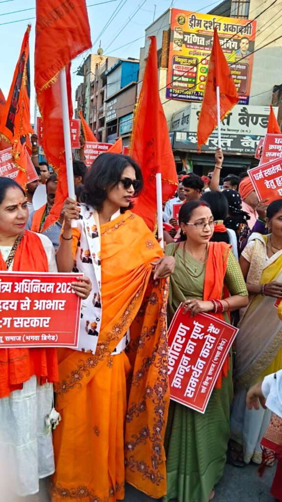 गांधी चौक से शाम करीब 6 बजे शुरू हुई यह रैली जूना बिलासपुर, गोल बाजार होते हुए देवकीनंदन चौक तक पहुंची। हाथों में बैनर, पोस्टर और भगवा ध्वज लिए लोगों ने पूरे रास्ते सरकार के समर्थन में नारे लगाए और विधेयक को जल्द लागू करने की मांग की। रैली में युवा, बुजुर्ग और बड़ी संख्या में महिलाएं भी शामिल रहीं। समापन तिलक नगर स्थित हनुमान मंदिर में सामूहिक हनुमान चालीसा पाठ और आरती के साथ हुआ।