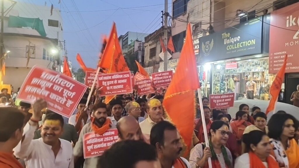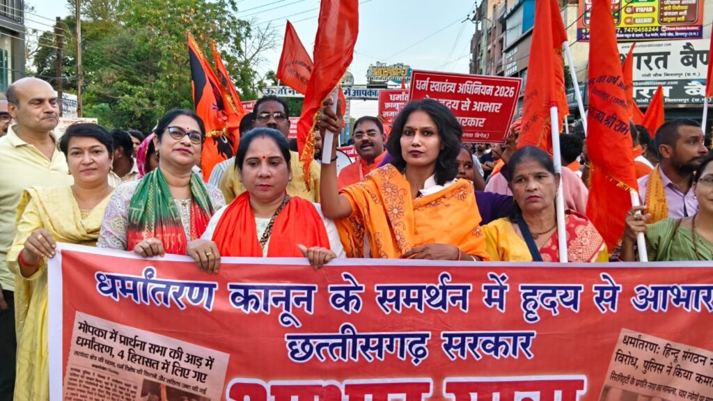 बिलासपुर। छत्तीसगढ़ में लंबे समय से विवाद और चिंता का विषय बने अवैध धर्मांतरण के मुद्दे ने एक बार फिर राजनीतिक और सामाजिक तापमान बढ़ा दिया है। राज्य सरकार द्वारा प्रस्तुत धर्म स्वातंत्र्य विधेयक 2026 के समर्थन में मंगलवार को बिलासपुर में सर्व हिंदू समाज के नेतृत्व में विशाल आभार रैली निकाली गई, जिसमें हजारों लोगों की भागीदारी देखने को मिली।