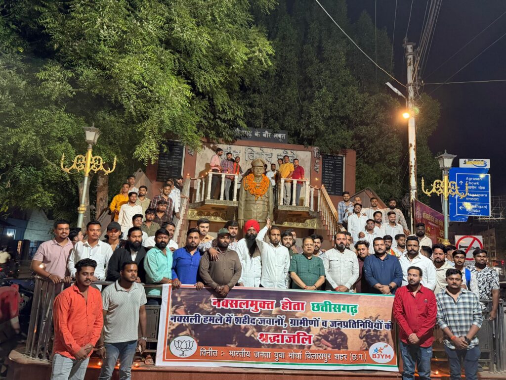 बिलासपुर। डबल इंजन की सरकार द्वारा चलाए जा रहे पुनर्वास कार्यक्रम और लगातार सुरक्षा अभियानों से प्रेरित होकर नक्सलियों द्वारा हथियार डालने तथा बस्तर के नक्सल मुक्त घोषित होने की ऐतिहासिक उपलब्धि पर भारतीय जनता युवा मोर्चा जिला बिलासपुर शहर द्वारा शहीदों को भावपूर्ण श्रद्धांजलि अर्पित की गई। नगर के लोकप्रिय विधायक अमर अग्रवाल कार्यक्रम में विशेशरूप से उपस्थित थे, उन्होंने तत्कालीन पुलिस अधीक्षक राजनांदगांव स्व.विनोद चौबे की प्रतिमा के समक्ष दीप प्रज्वलित कर माल्यार्पण किया। उनके साथ भाजपा जिलाध्यक्ष दीपक सिंह उपस्थित थे उन्होंने भी माल्यार्पण किया।