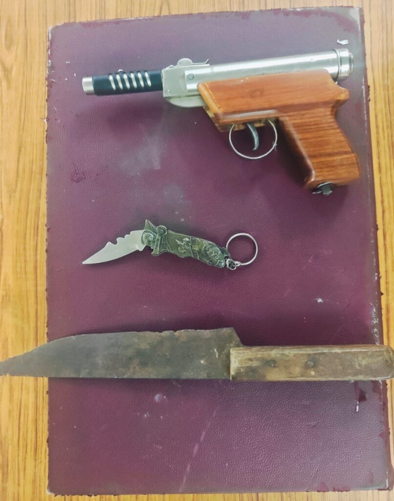 कार्रवाई के दौरान पुलिस ने आरोपियों के पास से एक धारदार चाकू, एक कट्टा नुमा हथियार और एक कार जब्त की। दोनों के खिलाफ आर्म्स एक्ट के तहत मामला दर्ज कर न्यायिक रिमांड पर जेल भेज दिया गया है।