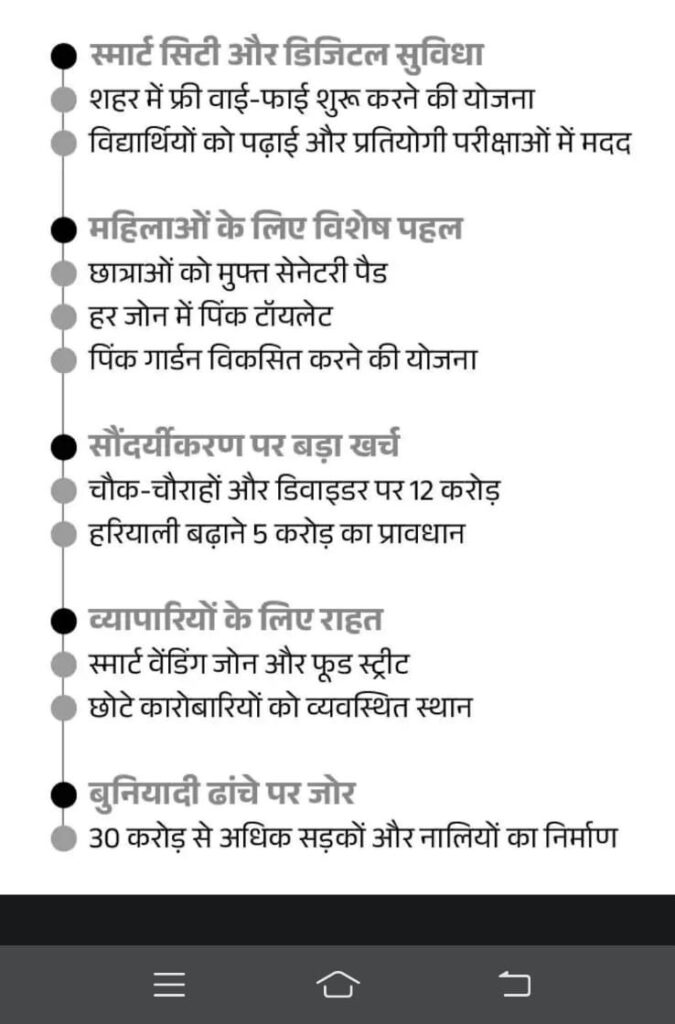 महापौर पूजा विधानी ने बजट पेश करते हुए कहा कि यह केवल निर्माण कार्यों तक सीमित नहीं है, बल्कि स्मार्ट सिटी सुविधाओं, महिलाओं की सुरक्षा और युवाओं की जरूरतों को ध्यान में रखते हुए तैयार किया गया है। सभा में 33 प्रतिशत महिला आरक्षण से संबंधित प्रस्ताव पारित कर राज्य शासन को भेजने का निर्णय भी लिया गया।