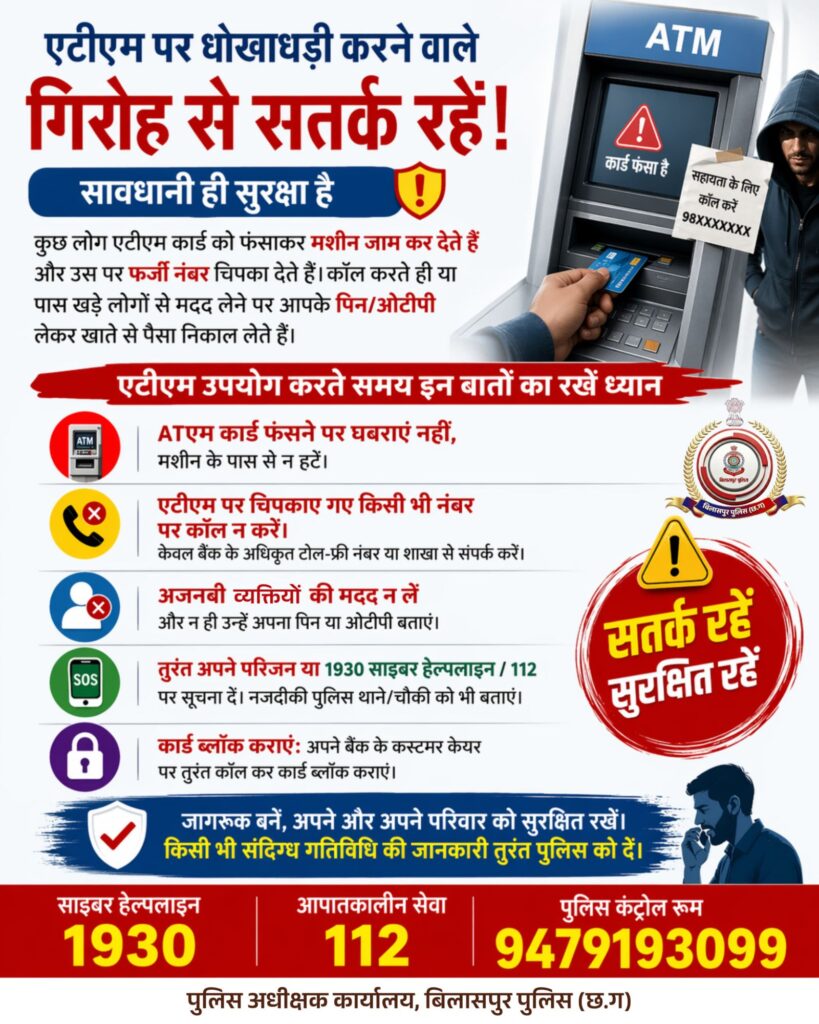 बिलासपुर, 25 अप्रैल 2026। बिलासपुर पुलिस ने एटीएम से जुड़ी बढ़ती धोखाधड़ी की घटनाओं को देखते हुए आम नागरिकों के लिए विस्तृत एडवाइजरी जारी की है। पुलिस ने स्पष्ट किया है कि ठग अब एटीएम मशीनों के साथ छेड़छाड़ कर लोगों को निशाना बना रहे हैं, ऐसे में सावधानी ही सबसे बड़ी सुरक्षा है।