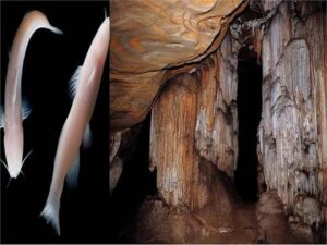 गुफाओं के भीतर बने जलकुंडों में पाई जाने वाली अंधी मछलियां वैज्ञानिकों के लिए विशेष रुचि का विषय हैं। इन मछलियों की आंखों पर पतली झिल्ली चढ़ चुकी है, जिससे वे देखने में असमर्थ हैं। विशेषज्ञों के अनुसार, गुफाओं में सूर्य का प्रकाश न पहुंचने के कारण लाखों वर्षों में इनकी दृष्टि समाप्त हो गई।